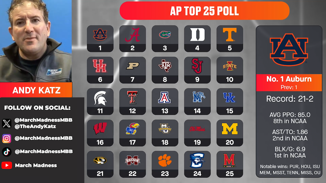 Should Alabama and Auburn falter in the slightest, the No. 3 Gators might be ready for the penthouse. This is already their highest ranking in 11 years. There is something almost mystical about Florida and its 20-3 record. The Gators had never beaten a No. 1 team at home in their history until Jan. 7, when they walloped top-ranked Tennessee 73-43. They had never beaten a No. 1 team on the road, until last Saturday, when they knocked off Auburn 90-81. The AP poll has been around for more than seven decades, and Florida is only the fifth team to upset two different No. 1 opponents in the same season.