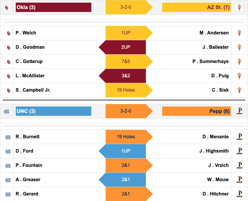 The No. 2 and 3 seeds in the 2022 DI men's golf tournament match play have been eliminated in the first round. Oklahoma lost 2-2-1 to Arizona State and North Carolina lost 3-2 to the defending champions, Pepperdine, in the quarterfinals.