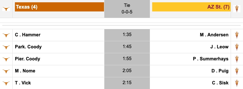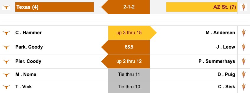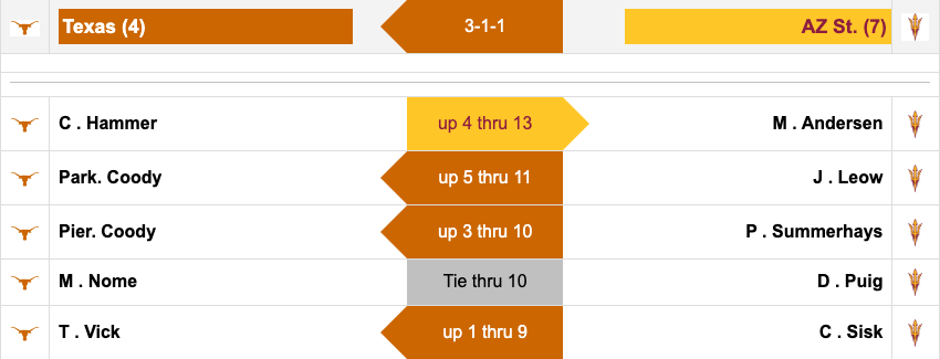 Both ASU and Texas have significant leads in one match. Arizona State's Mason Andersen is up four through 12 over Cole Hammer, and Hammer's teammate Parker Coody is up five through 11 over James Leow.