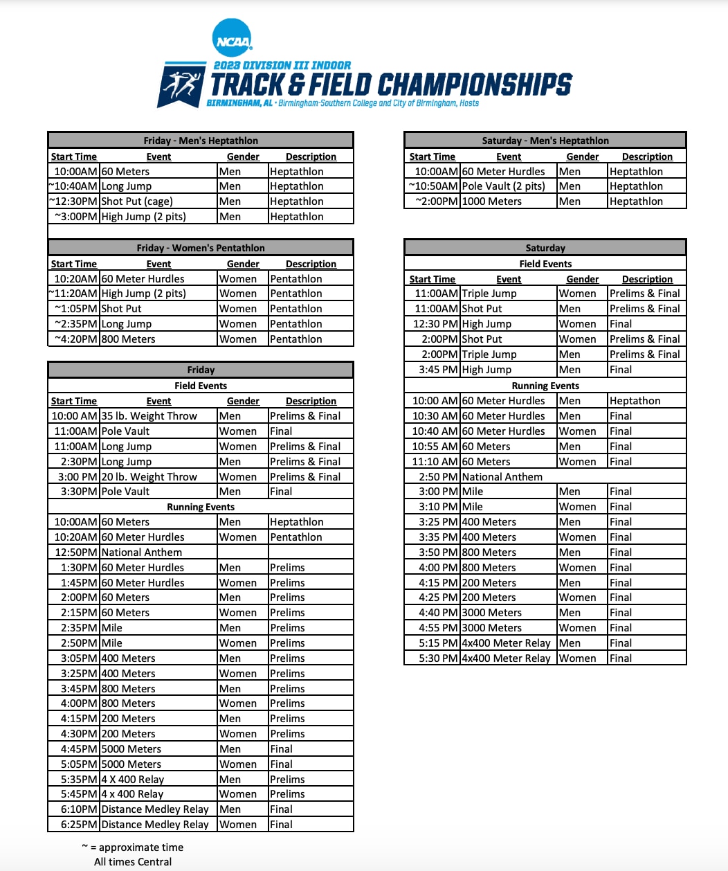 INDIANAPOLIS — The NCAA Division III Men’s and Women’s Track and Field and Cross Country Committee announced today the participants in the 2023 NCAA Division III Men’s and Women’s Indoor Track and Field Championships.