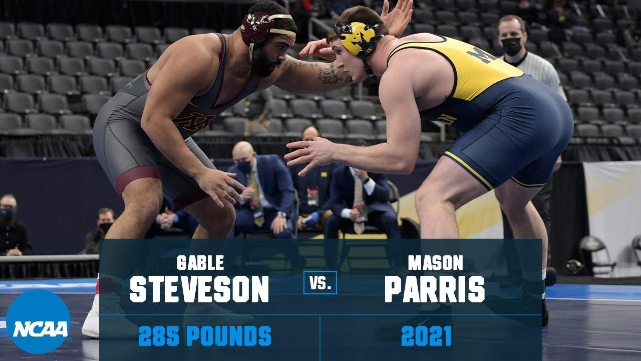 This was a match Gable Steveson had been waiting for since losing to Anthony Cassar in the 2019 NCAA semifinals. It wasn't that Steveson really wanted to wrestle Parris again — he'd certainly had plenty of matches against the Michigan heavyweight — but he wanted to wrestle in the NCAA finals, an opportunity that had eluded him. After winning the Big Ten championship in 2020, Steveson was the favorite to capture his first national title in his home state, but COVID ruined his plans. Through preparation and patience, Steveson was finally back, and this time, he wasn't leaving without gold.