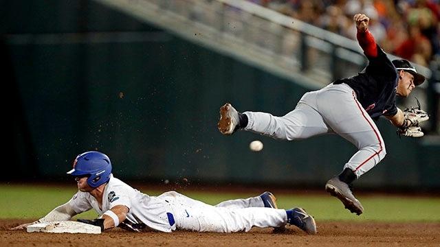 Why we love it: Oregon State just wouldn't let its time in Omaha come to an end. Game 2 of the finals is sure to be remembered for a while in college baseball history, and this photo captures that historic game. Why we love it: Often in sports, the victories come along with the pain of a loss. This photo captures a tender moment with Gators head coach Kevin O'Sullivan and his children, who consoled him after the loss to Arkansas which eiminated them from Omaha. Florida entered the College World Series as the defending champs, and many thought they could maybe do it again. Why we love it: Arkansas was a team riding high throughout the College World Series. The Razorbacks were 3-0 entering the finals. Despite the tough loss in the finals, we can't forget about Arkansas' impressive run in Omaha this year. This photo of Carson Shaddy and Jax Biggers jumping for joy proves just that. Why we love it: Well rain was a thing in Omaha this year. We had the finals pushed back a day due to weather, and one game even had a four-hour delay. We know the busiest person in Omaha this year was meteorologist. And you have to show some love to the grounds crew for all their hard work. Why we love it: This is proof that baseball in a contact sport. We appreciate this awesome action shot as a reminder of the impressive quick play we saw in the College World Series. In this shot, Gators shortstop Deacon Liput takes a hard dive to steal second base, sedning Texas Tech's Michael Davis flyting trying to make a play. Why we love it: Although it may look easy, catching a fly ball takes skill. On this particular play, two Texas players, Mason hibbeler and Tate Shaw, each attempted to make a play. Although the pair got quite close to each other, the play was made, even if it wasn't the prettiest. Why we love it: No explanation needed. Why we love it: A chance to play in Omaha is not something that comes every year. The emotion of being eliminated is very raw in this photo above. For Texas Tech, this was its third College World Series appearance in five years. Why we love it: Benny Beaver, Oregon State's mascot, somehow found his way to the top of the iconic dog pile after the final out. This beaver got hops. Why we love it: This one captures the beauty of college baseball — and the magic that is Omaha.Can't wait for the 2019 College World Series? Us either. Check out the dates here.