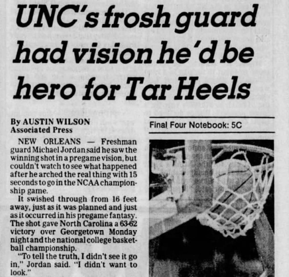 In 1982, a freshman guard by the name of Michael Jordan hit the game-winning jumper for North Carolina as the Tar Heels defeated Georgetown. He later told the media that he had previously seen himself hitting the game-winner in a pregame vision, according to the AP game recap.
