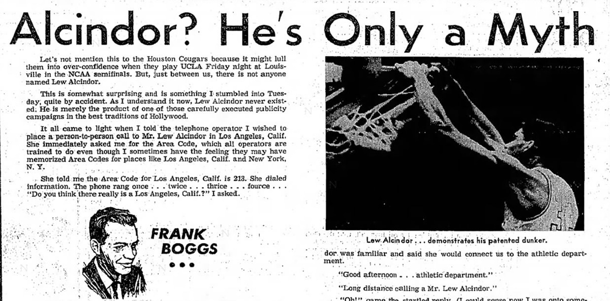 Chicago Tribune: "Did you hear about Lew Alcindor chopping down the cherry tree and then confessing to the Establishment, 'Father, I cannot tell a lie!'? Did you hear about Lew Alcindor driving the snakes from Ireland? Have you heard about Lew Alcindor, the boy, splitting rails in downstate Illinois? You probably have listened to all these tales, and more, too, because Lew Alcindor β star sophomore on the University of California at Los Angeles basketball team β is the most publicized athlete of our time."