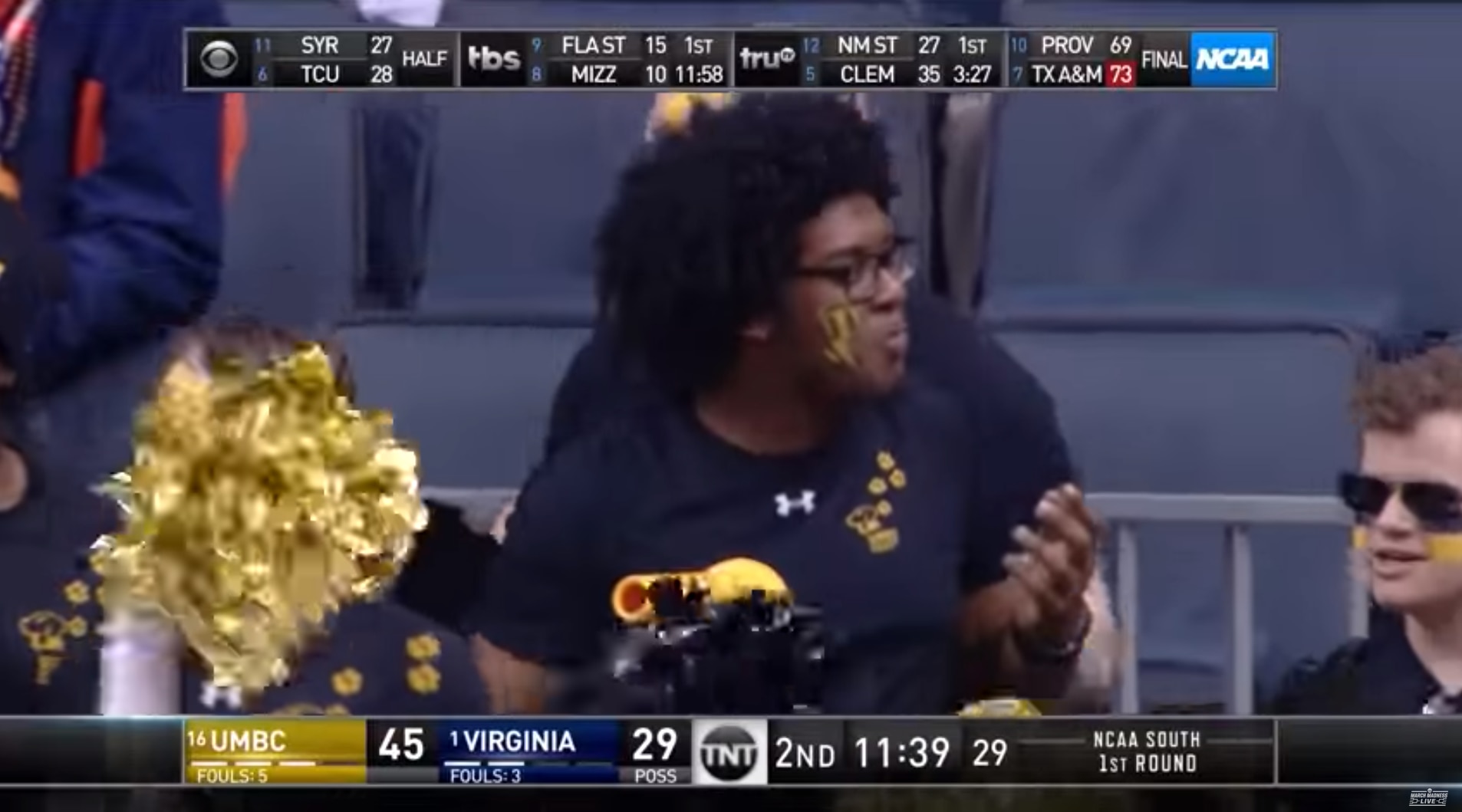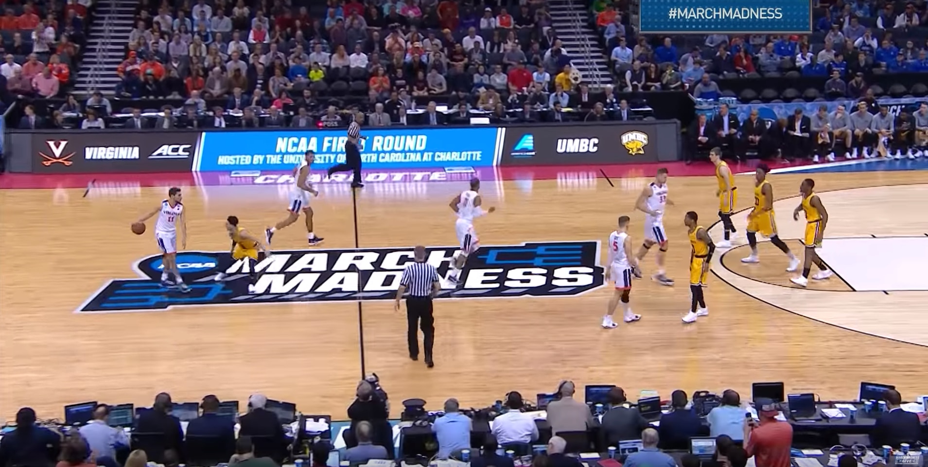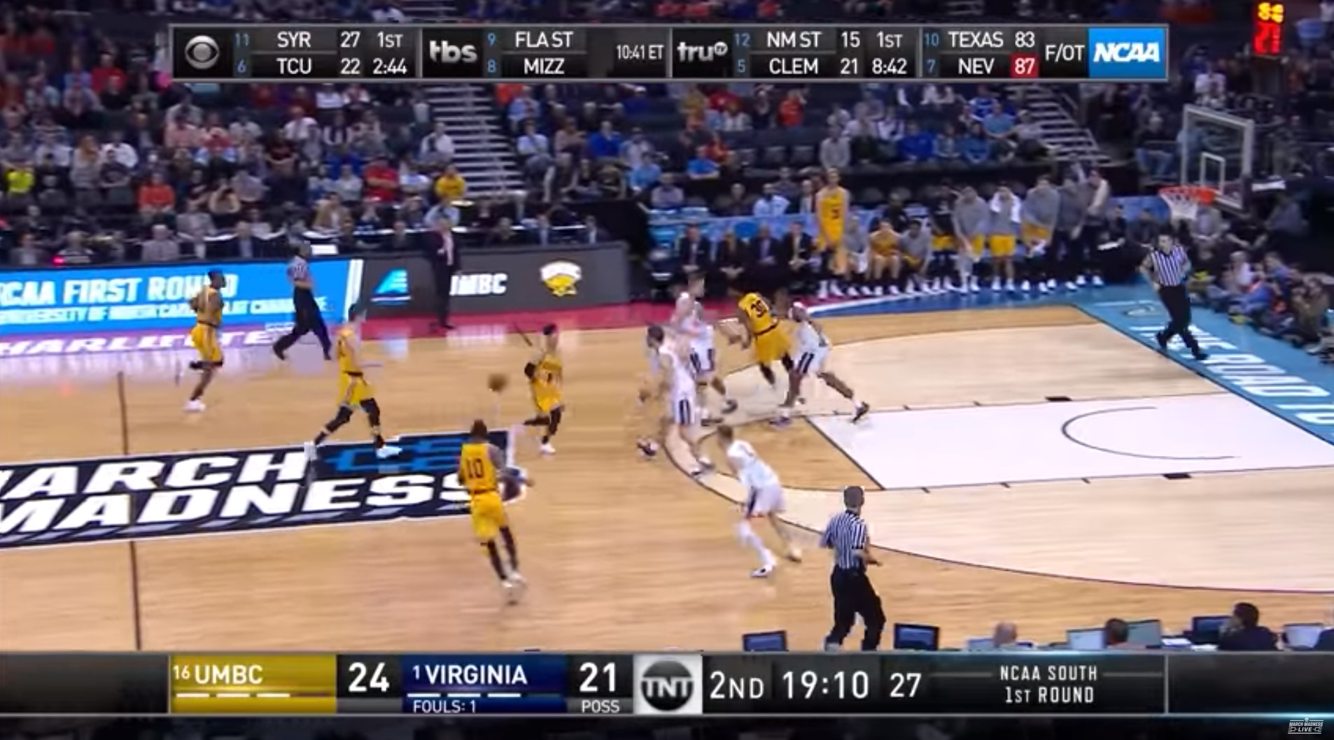 UMBC's fifth 3-pointer of the first half, made by Lyles, could not have been more open, as Virginia got lost in its defensive rotations amid a broken play and somehow, UMBC's 20-points-per-game scorer was left alone at the top of the key. It was after this shot that an audible "DE–FENSE" chant could be heard on the broadcast, whereas the Virginia fan contingent had certainly been the more vocal one before that.