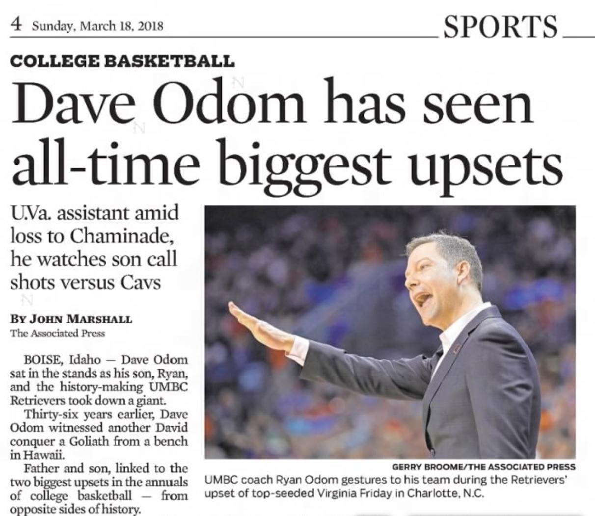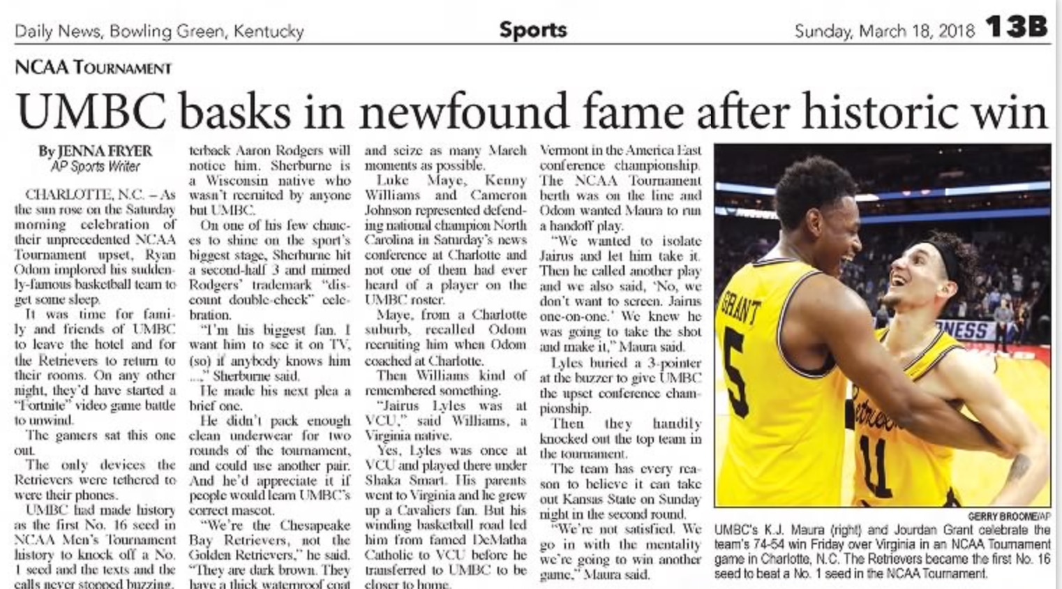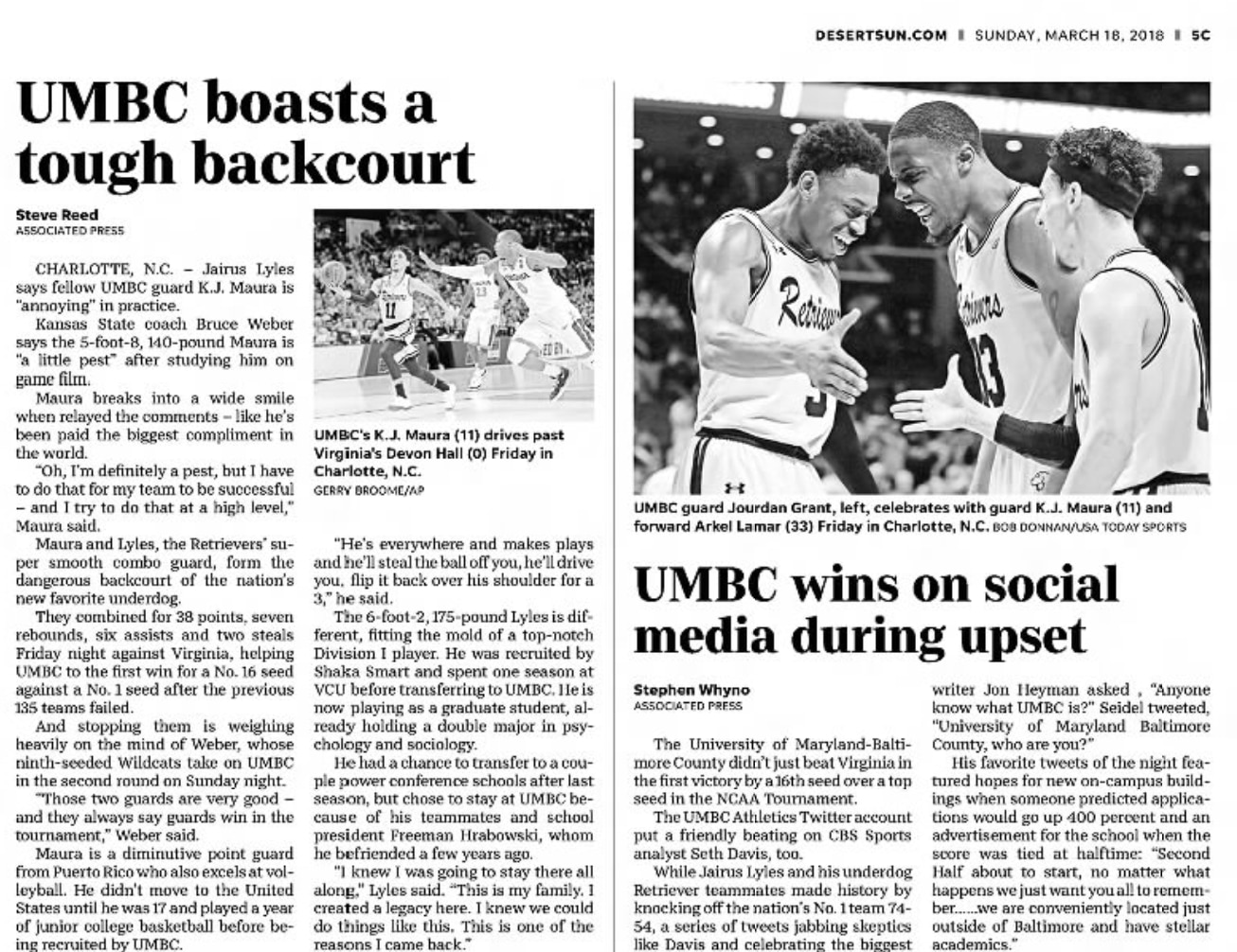 When the ball was tipped, UMBC point guard K.J. Maura, a senior listed at 5-foot-8 and 140 pounds who personified the underdog spirit of the Retrievers, stood on the far right edge of the March Madness logo at midcourt, with his left foot on the final "S" in "Madness." With the game being played in Charlotte, the announcing team made several comparisons to Muggsy Bogues, the 5-foot-3 former NBA player who spent a decade with the Hornets.
