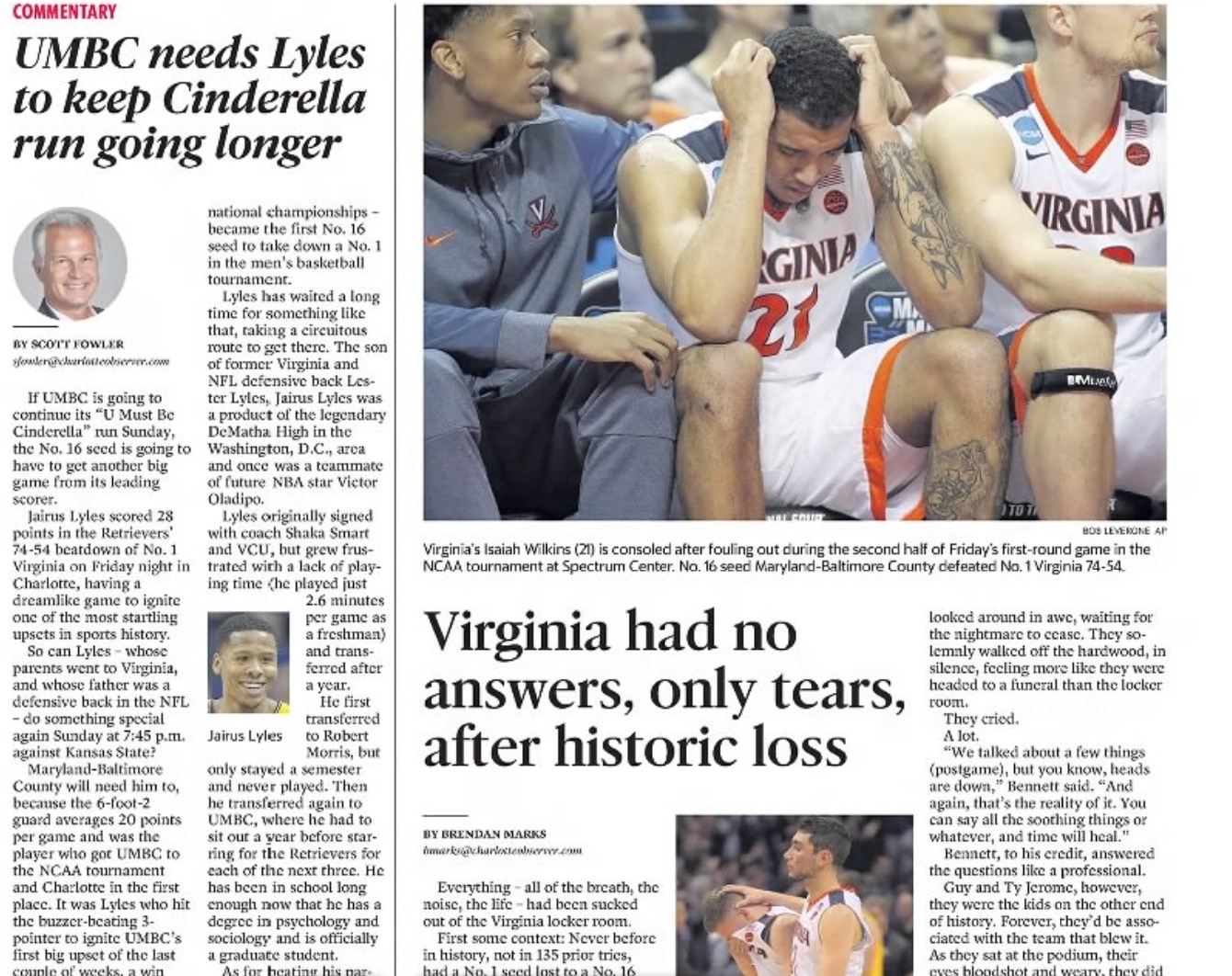 The scoreboard read 21-21 at halftime, but UMBC actually had the chance to take the lead before the break as Lyles attempted a long 3-pointer in the final seconds that was off the mark. The frustration was setting in for Virginia as guard Kyle Guy balled his fist and batted the ball, after the halftime horn sounded, with his 31-3 Cavaliers tied with those 24-10 Retrievers.