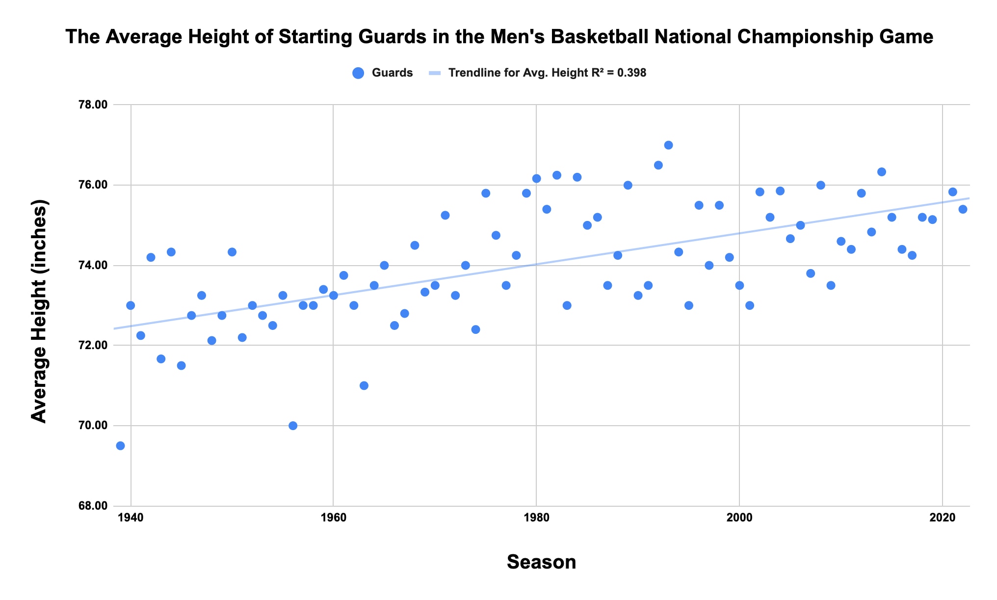 A given men's basketball season can explain roughly 39 percent of the variance in the height of starting guards in the men's basketball national championship game.