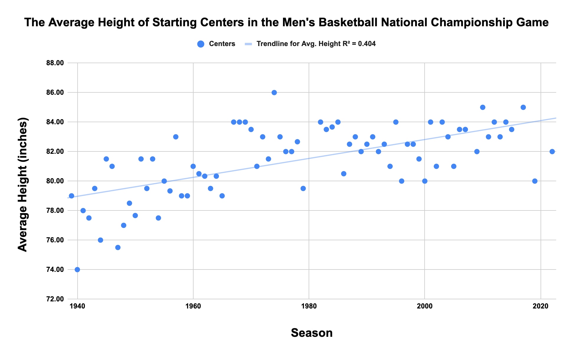 A given men's basketball season can explain roughly 40 percent of the variance in the height of starting centers in the men's basketball national championship game.