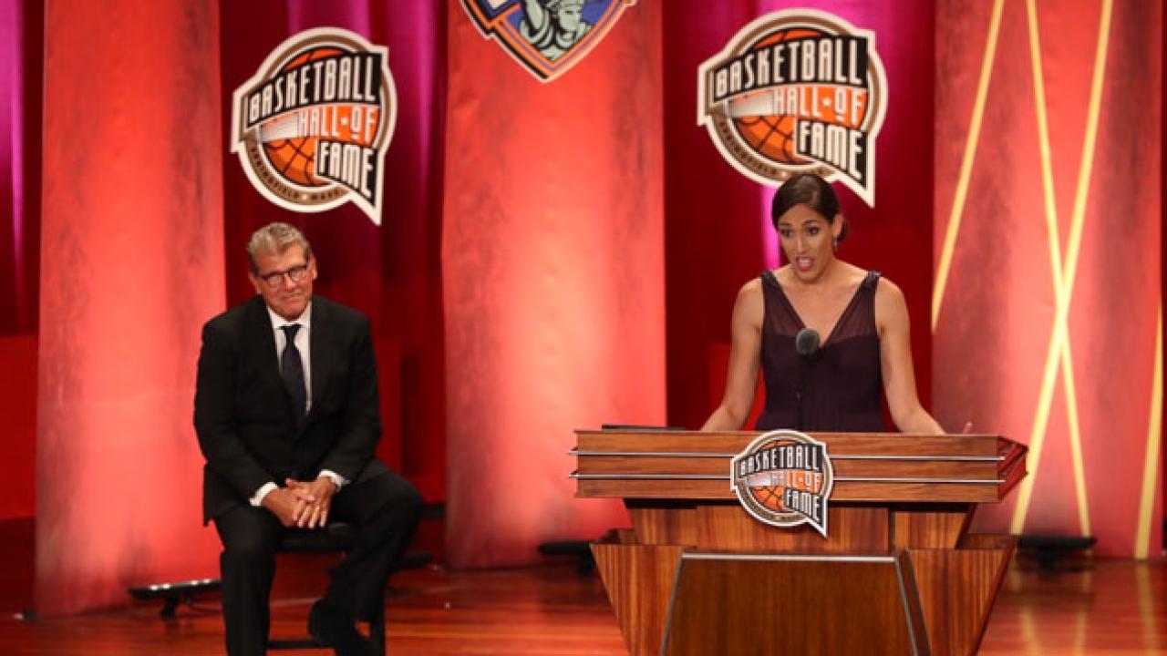 So she was very much the hometown favorite. And with her college coach, a 2006 inductee, seated nearby, Lobo began her speech in her hometown and ended back with Auriemma.
