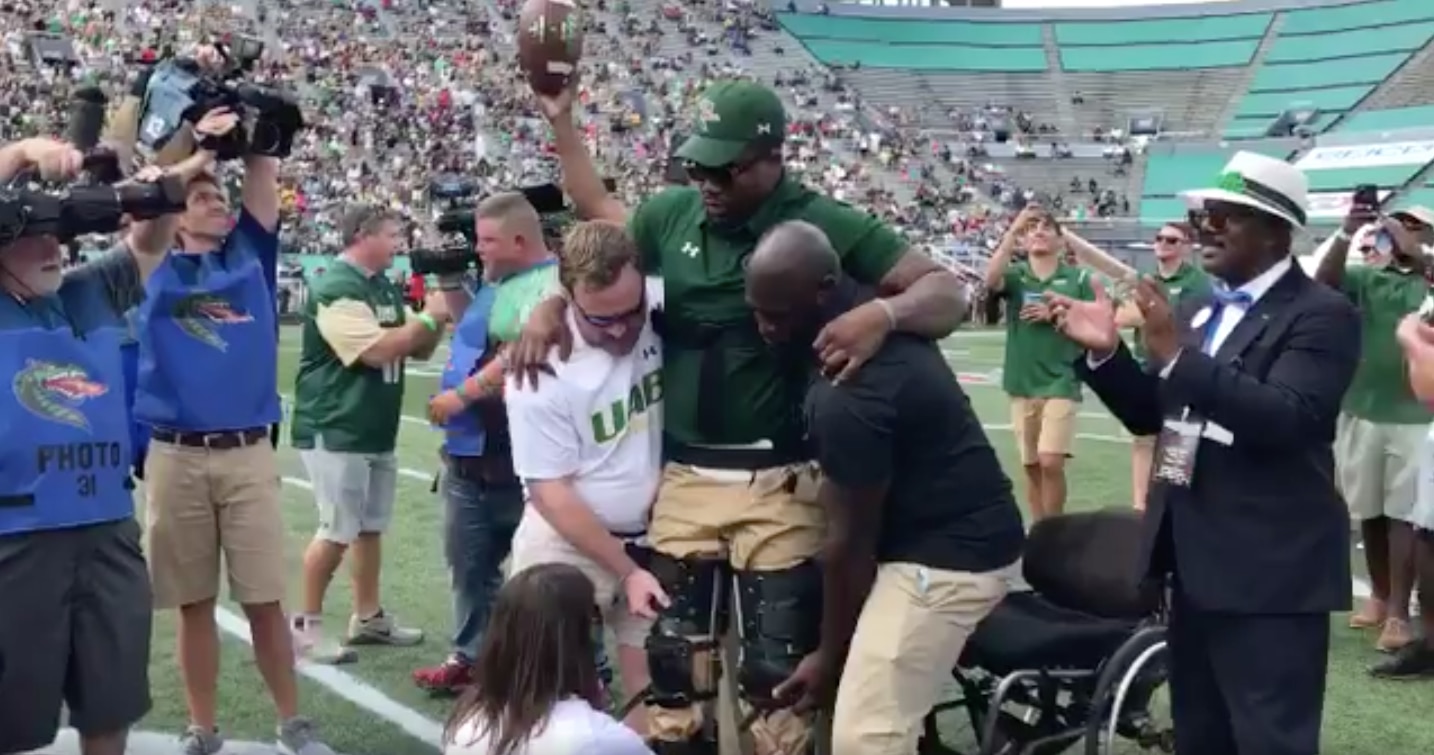 Timothy Alexander promised he would walk out on the field when the UAB football team returned. Saturday marked the return of the Blazers, and Alexander – a 2015 UAB grad and the team's director of character development – held up his promise, presenting the game ball after getting out of his wheelchair and walking to midfield with some assistance.