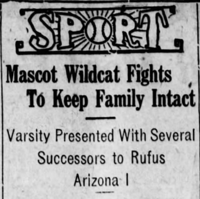 "As the result of a thrilling adventure which befell Stanford Williams, a ferocious mother wildcat and four kittens were captured, the University of Arizona has at last procured a mascot to succeed Rufus Arizona I, peace to his ashes," the Arizona Daily Star reported. "The adventure came about when Mr. Williams, while prospecting in the mountains about 40 miles southwest of here, entered a deserted tunnel and as he was examining the character of the rock, was attracted by a soft mewing, which upon investigation was found to be the ensemble protest of four little wildcats huddled together in the corner of the cave. Mr. Williams caught them, put them in his specimen pocket and carried them to camp."