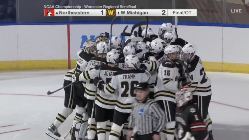 College hockey fans at the Worcester, Massachusetts regional were treated to a ton of extra hockey. First, Western Michigan and Northeastern needed an extra frame. The winner from Luke Grainger was a really tough one for Levi to give up after he gave the puck away behind the net.