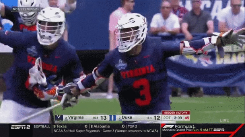 UVA advanced to the championship game thanks to a double overtime game-winner from Ian Laviano against ACC rival Duke. The Cavs won the back-and-forth affair 13-12.
