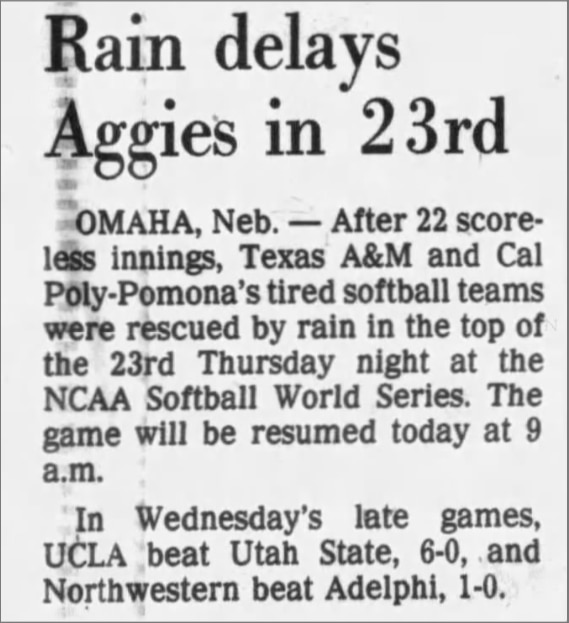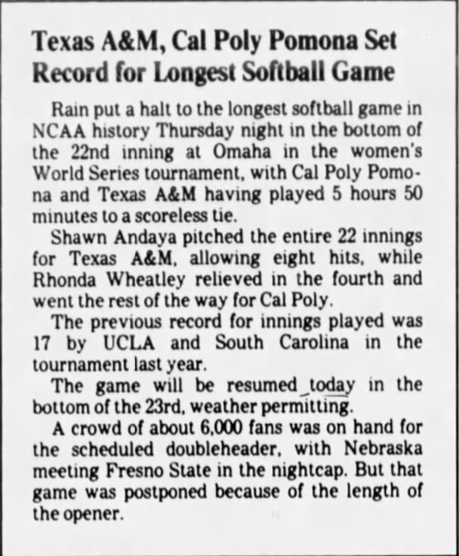 Cal Poly went on to play Fresno State in a 12-inning game later that day. The Broncos lost 1-0 on a wild pitch — another tricky play at home. The team went 37 innings in two games without scoring a run. Cal Poly had to drop the softball program in 1993 after seven appearances in the WCWS.