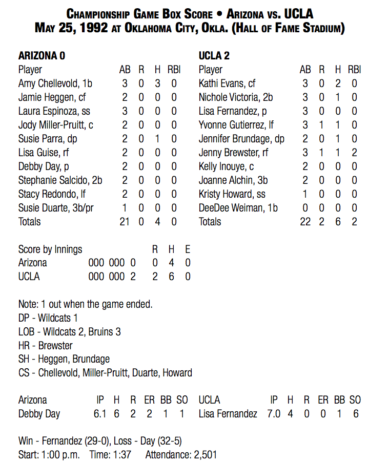 Fast forward to 1992. Fernandez is the ace for the Bruins in the midst of a perfect junior season. The softball is still white. Yes, white. The Bruins are facing Arizona, and Debby Day was in the circle for the Wildcats. Fernandez described Day as a competitor, just like she was.