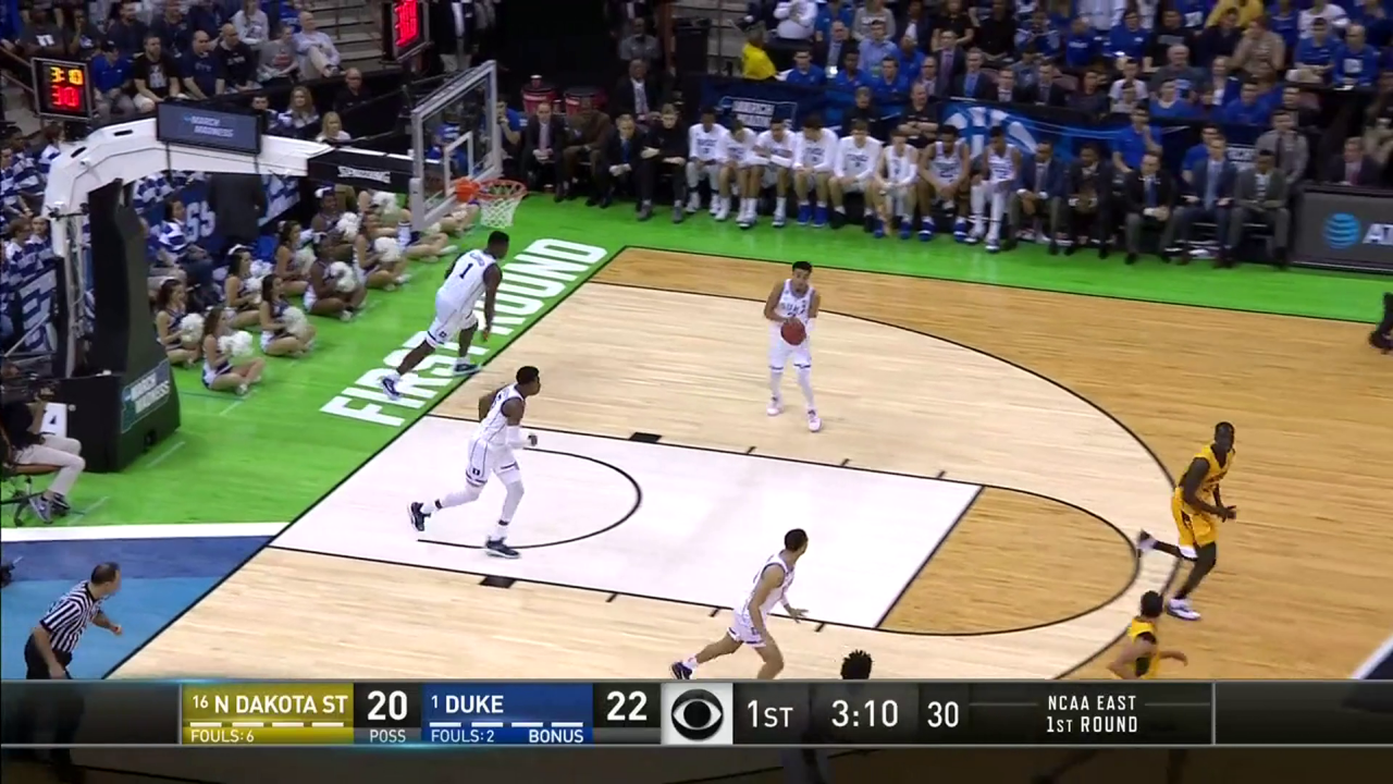This was a four-point game at halftime. North Dakota State was hanging with the Blue Devils, scoring at the same rate Duke was and getting the ball inside just enough. Vinnie Shahid had 13 points in the first half.
