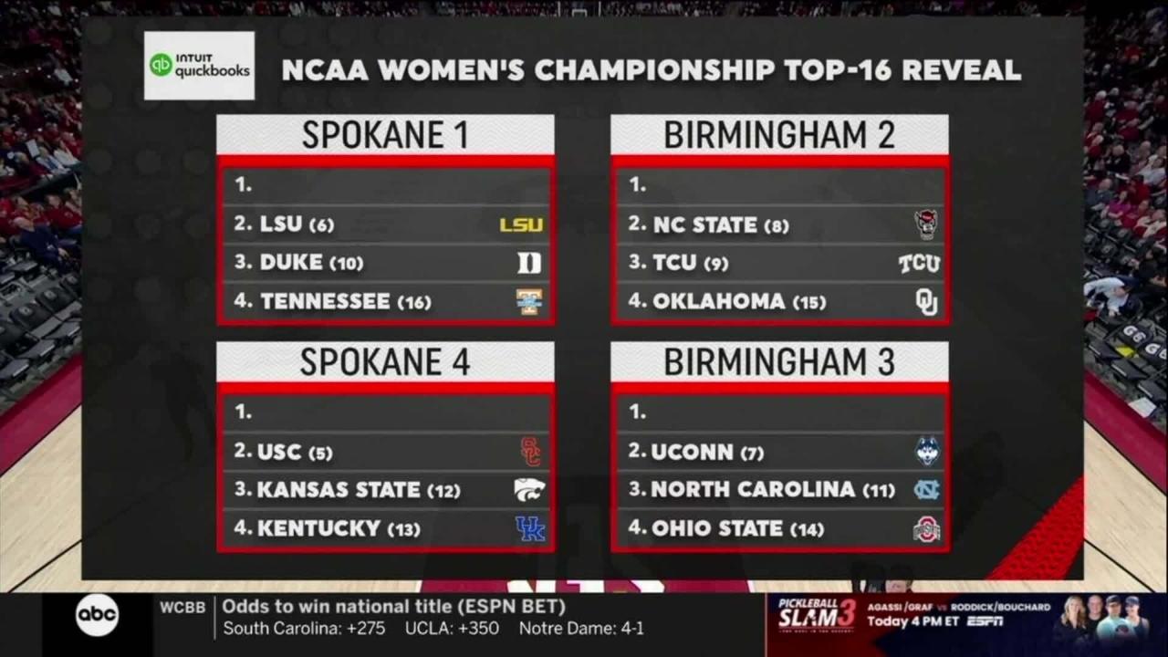 The committee provided region assignments for all 16 seeds, with Spokane Regional 1 including top seed UCLA, LSU, Duke and Tennessee. Birmingham Regional 2 included South Carolina, NC State, TCU and Oklahoma. Birmingham Regional 3 included Texas, UConn, North Carolina and Ohio State. Spokane Regional 4 includes Notre Dame, Southern California, Kansas State and Kentucky. The number listed next to the regional site location (e.g. Spokane Regional 1) reflects the true seed number of the number one seed within that respective regional pod.