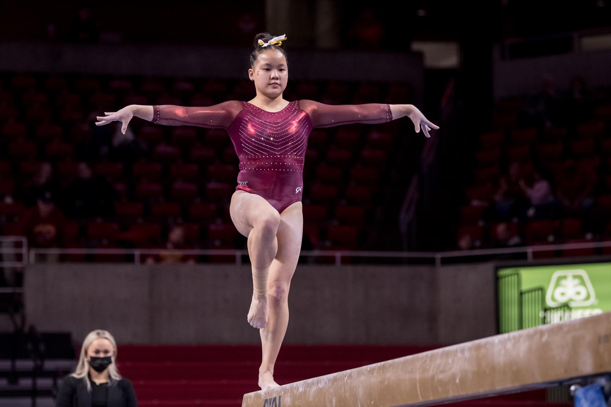 The 2021 national bronze medalist on bars arrived at Iowa State with a solid repertoire of skills, but sheâs kept improving ever since, showing off a brand new Yurchenko 1.5 on vault and a double layout on floor in training. We love to see gymnasts who keep learning and improving in college!
